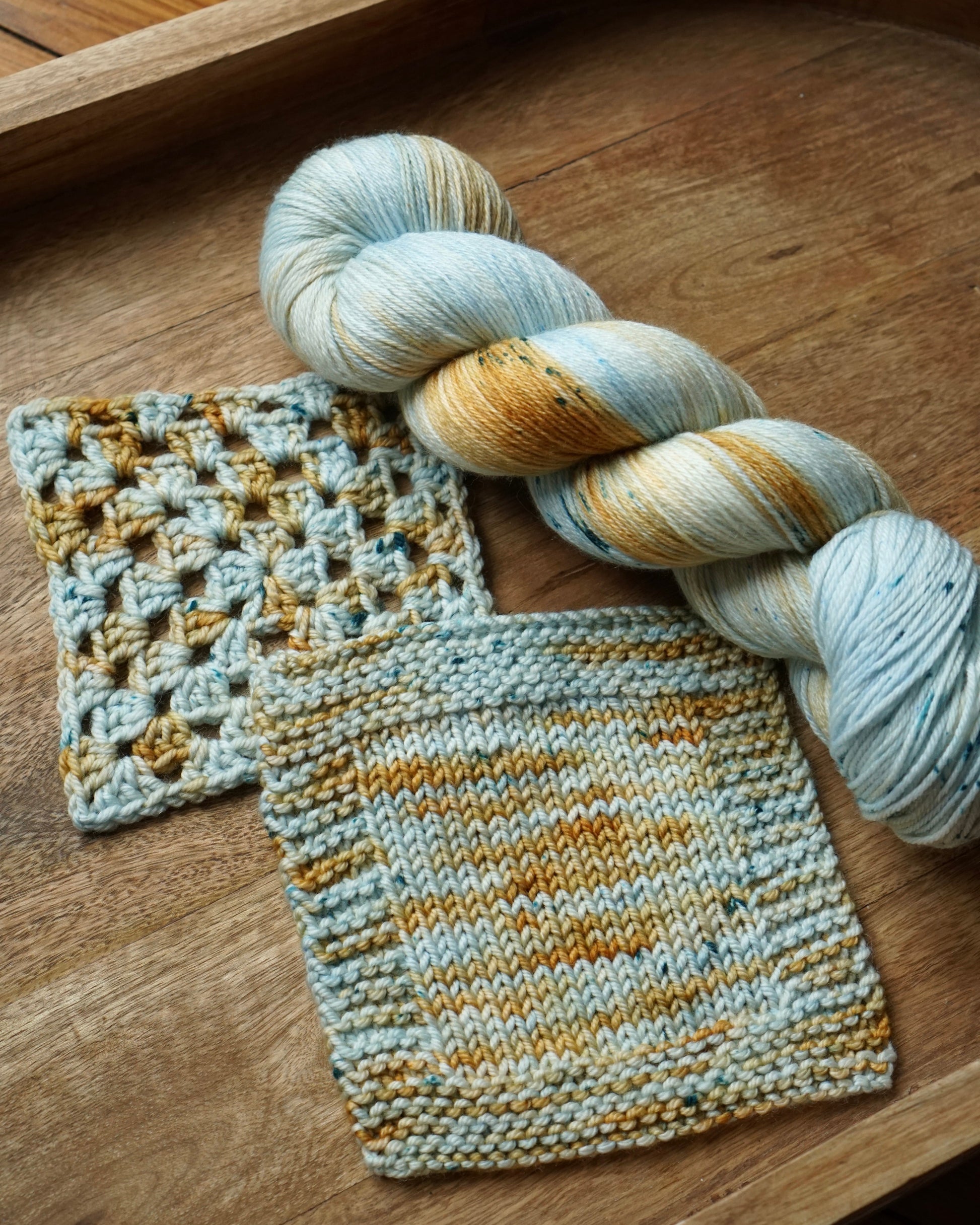 A variegated blend of pastel sky blue with warm golden yellow and a speckling of jewel-tone teal green.